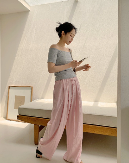 Áo thun trễ vai quyến rũ, nhưng không kém phần trẻ trung, năng động. Khi kết hợp mẫu áo màu xám với quần vải thô, hồng pastel, bạn có được outfit vô cùng nữ tính.