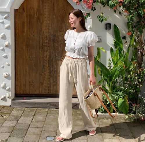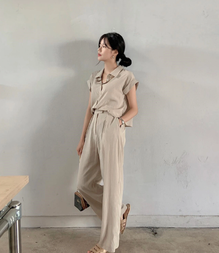 Set đồ đồng bộ gồm áo sơ mi và quần vải thô, ống rộng đơn giản mà chẳng hề tốn thời gian. Thao tác sơ vin sẽ hack dáng hiệu quả và tăng độ chỉn chu cho người mặc. Để bảo toàn nét tinh tế của outfit, chị em nên đi giày màu be.