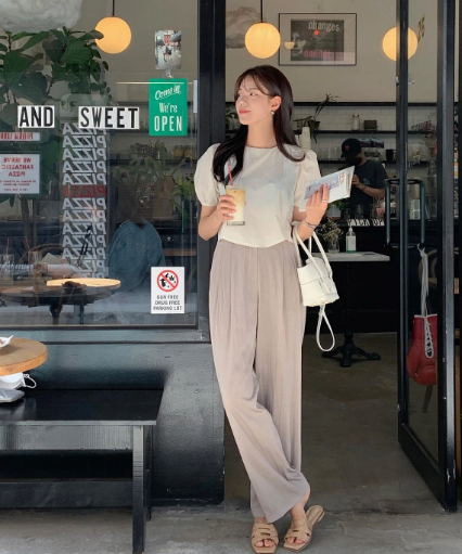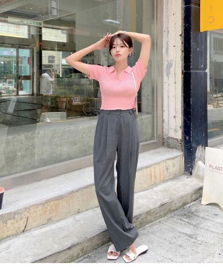 Đừng bỏ qua những chiếc áo len cộc tay. Khi kết hợp áo len màu hồng pastel với quần vải thô, màu ghi xám, không cần sơ vin, chiều cao vẫn được cải thiện.