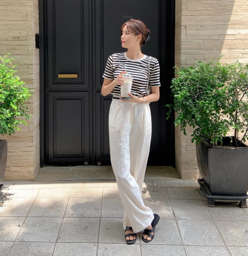 Áo thun kẻ ngang kết hợp với quần trắng vải thô, giày dép màu đen là có được outfit đầy thanh lịch, thời thượng. Chị em nên sơ vin để vừa hack dáng, vừa nâng tầm phong cách.
