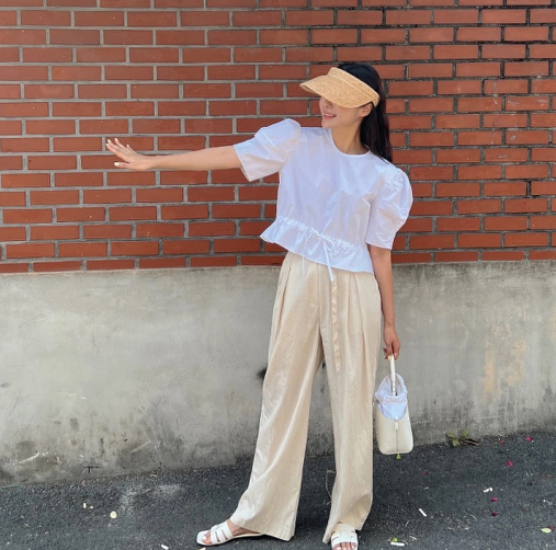 Combo áo blouse trắng + quần cạp chun chắc chắn sẽ không làm bạn thất vọng. Túi cói là mảnh ghép hoàn hảo của bộ đồ, giúp tổng thể trang phục thêm nổi bật mà vẫn trang nhã.