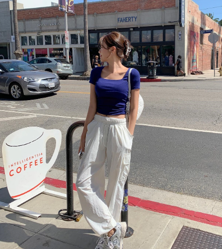 Áo crop top kết hợp với quần vải thô, túi hộp. Đôi giày sneaker rất phù hợp với nét khỏe khoắn của bộ đồ.