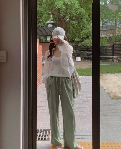 Công thức áo hai dây trắng và quần vải thô xanh nhạt trẻ trung rất hợp với những buổi dạo phố cuối tuần, hoặc đi du lịch. Các món phụ kiện như mũ cói, túi cói và dép xỏ ngón... đảm bảo sự mới mẻ, năng động của set đồ.