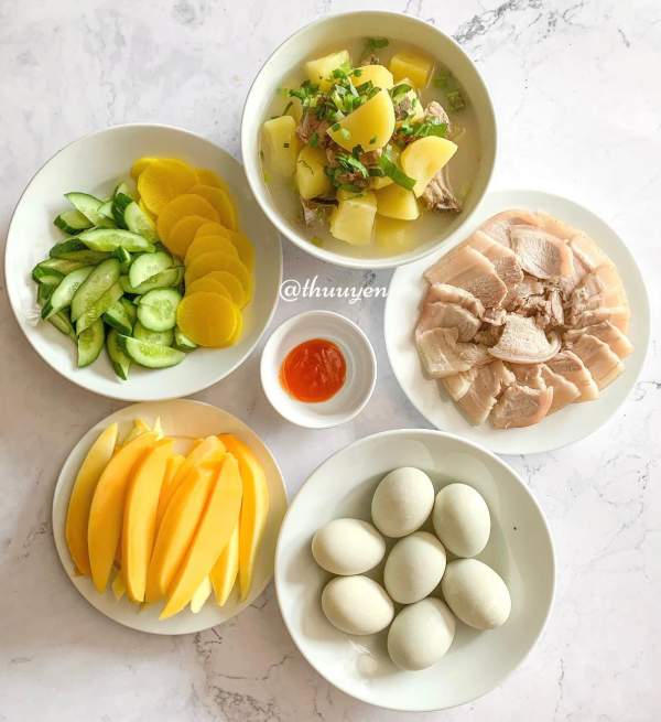 Canh xương khoai tây; thịt luộc; trứng vịt lộn; rau củ muối; xoài