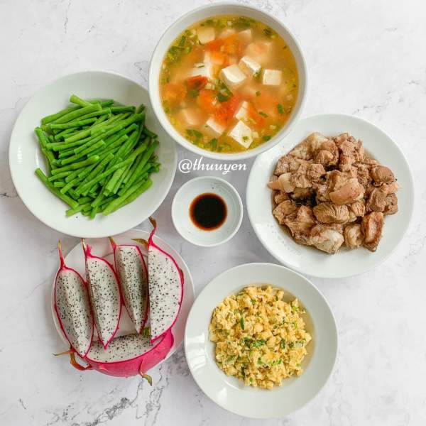Canh đậu; Đỗ luộc; Trứng xào; Thịt chân giò kho đông; Thanh long