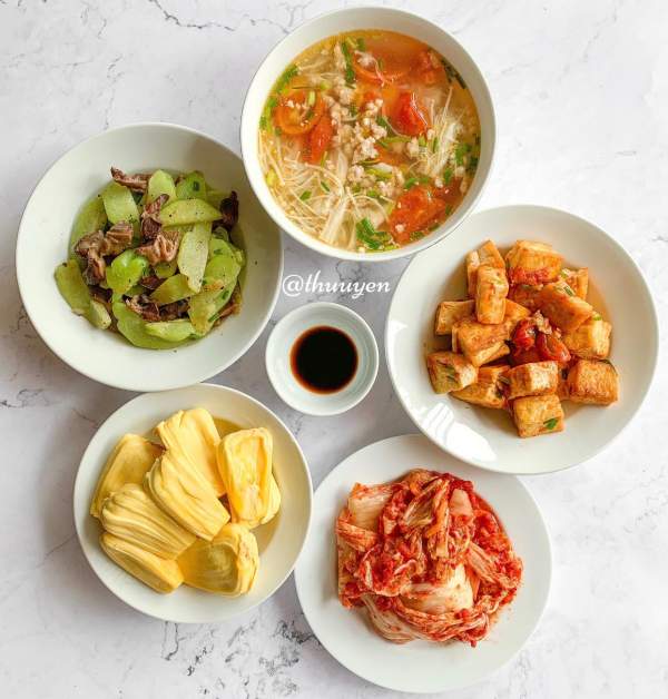 Canh nấm kim châm thịt băm; Su su xào mề gà; Đậu sốt cà; Kim chi ăn kèm; Mít