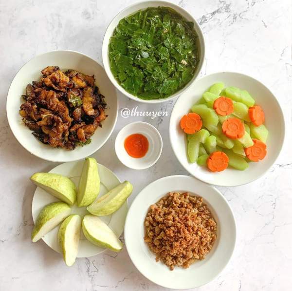 Canh rau ngót; Thịt nướng lá mắc mật; Thịt băm rang gừng; Su su cà rốt luộc; Ổi