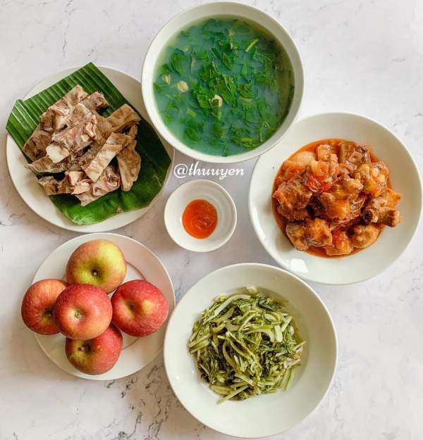 Canh ngao mồng tơi; Giò tai xào; Sườn xào chua ngọt; Dưa chua; Táo