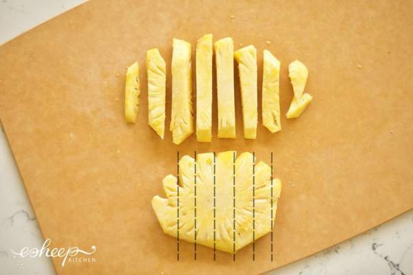 Mỗi thanh to lại bổ làm 4, bạn sẽ được các que dứa nhỏ đều nhau không gãy tẹo nào. Chấp nhận bỏ đi một xíu mép ngoài như hình.