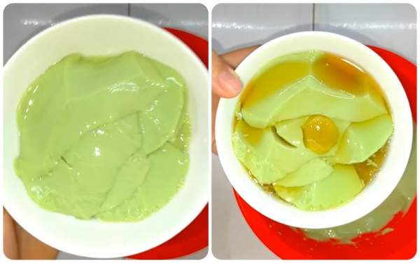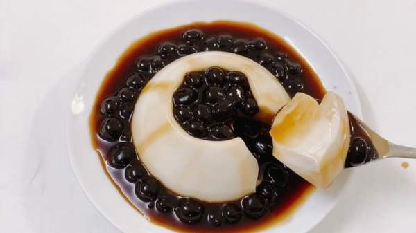 Khi tào phớ đã đông thì lấy ra bát, thêm trân trâu, trái cây và nước đường nâu phủ lên trên.