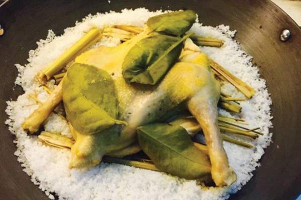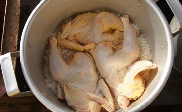 - Tiếp theo rải lớp muối dày khoảng 1cm dưới đáy nồi rồi cho gà vào sao cho gà không chạm xuống đáy nồi. Sau đó bạn bật bếp đun với lửa nhỏ cho thịt gà chín. Khi luộc gà bạn nhớ không mở vung. Hơi nóng từ muối sẽ làm gà khi chín.