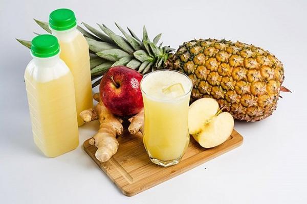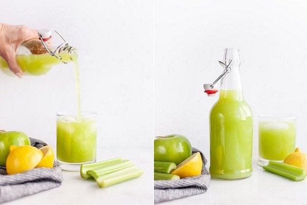- Cho tất cả các nguyên liệu trên vào máy ép để ép lấy nước. Sau đó đổ nước ép thu được ra cốc và thưởng thức. Bạn có thể cho thêm mật ong để dễ uống hơn. Ly nước ép lúc này có màu xanh của cần tây, có vị ngọt của dứa, chua chua của táo và thơm của gừng.