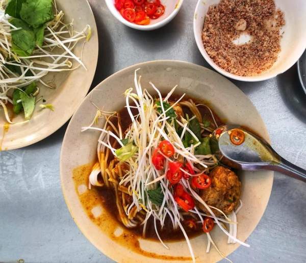 Bánh tằm cay nổi tiếng ở Cà Mau có nước sốt ấm nóng, ăn kèm với thịt gà, xá xíu. Ảnh: @si.nguyen_/Instagram