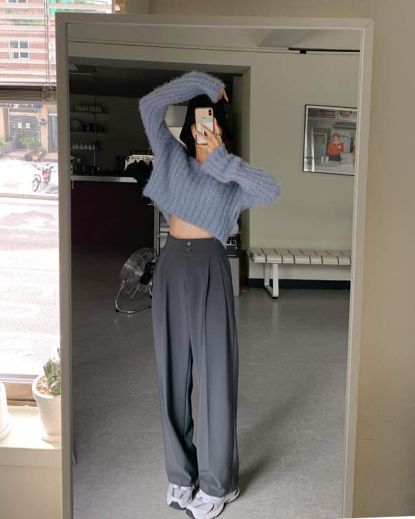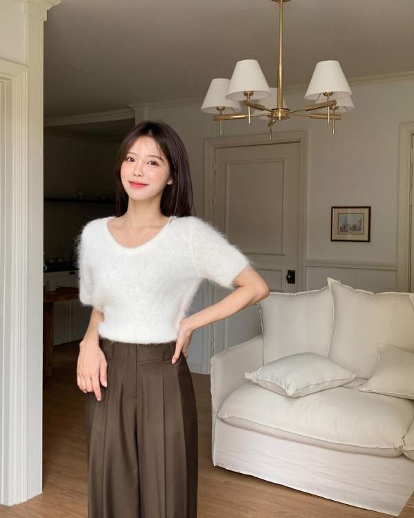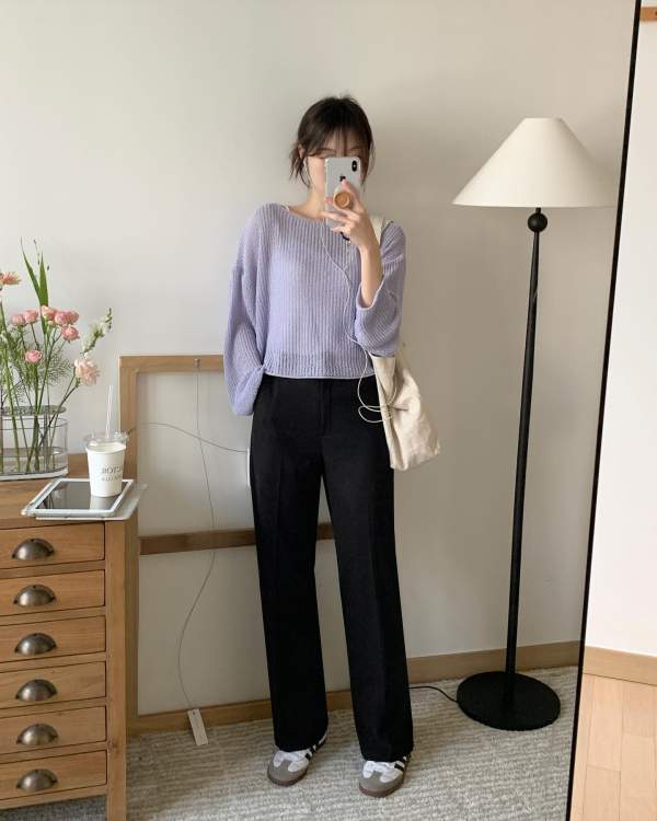 Áo len sáng màu phù hợp để diện cùng quần âu tối màu. Hai món thời trang này sẽ tạo nên bộ trang phục nổi bật, "hack" tuổi hiệu quả nhưng vẫn có được sự hài hòa, tinh tế. Kết lại bộ trang phục, bạn nên chọn một trong những kiểu giày thời thượng như boots, loafer, giày Mary Jane hoặc giày sneaker trắng.