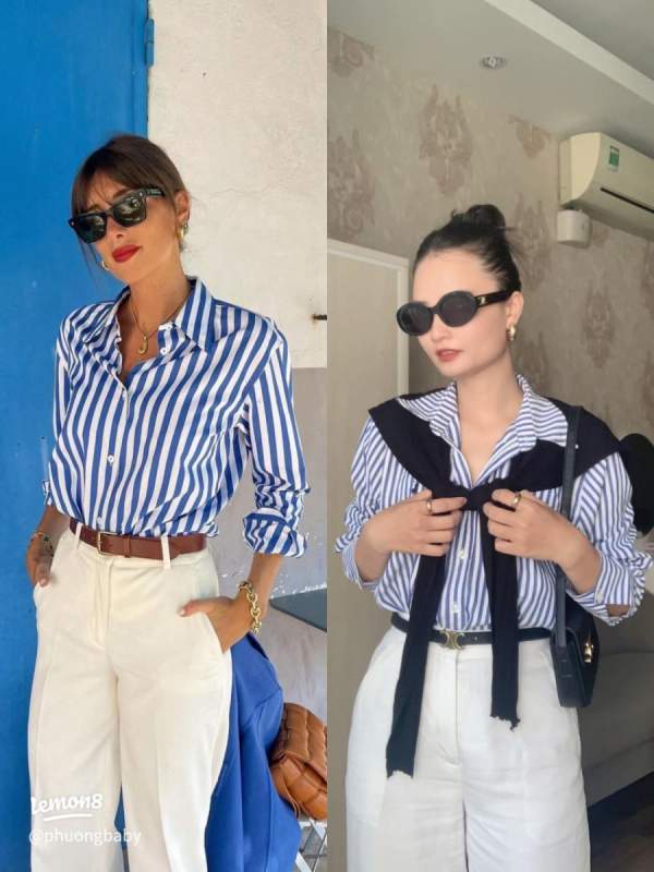 Áo kẻ sọc là lựa chọn lý tưởng khi muốn tăng điểm nhấn mà không làm mất đi sự thanh lịch. Khi kết hợp với quần trắng, họa tiết sọc giúp tạo hiệu ứng thị giác, khiến vóc dáng trông cao ráo và gọn gàng hơn.