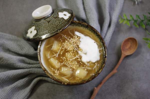 Sự cân bằng của hai mặt đối lập bỗng trở nên hài hòa. Trong lớp nước sóng sánh ngọt dịu từ mật mía xen lẫn vị cay cay của gừng già. Bên ngoài lớp vỏ trắng, dẻo, mềm mịn, còn bên trong lớp nhân tròn vị của mè đen và đậu phộng giòn, thơm bùi... luyến lưu đầu lưỡi khiến cho thực khách mê mẩn.