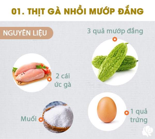 Nguyên liệu: - 2 trái mướp đắng, 2 cái ức gà, 2 thìa nước tương, 1 thìa hắc xì dầu, 1 thìa dầu hào, 1 thìa muối, 1 thìa tinh bột, 1 quả trứng, 1 củ hành lá và 30g nước gừng (gừng giã nhỏ hòa với nước để lấy 30g nước cốt gừng). Nước sốt: 1 thìa nước tương, 1 thìa dầu hào, 1 thìa hắc xì dầu, nửa thìa nước sốt cà chua, 1 thìa tinh bột, nửa bát nước