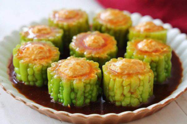 Cho 1 thìa nước tương, 1 thìa hắc xì dầu, nửa thìa nước sốt cà chua, 1.5 thìa tinh bột, khuấy đều với nửa bát nước. Cho một ít dầu ăn vào nồi, sau khi dầu hơi nóng thì đổ nước sốt vào, khuấy liên tục cho đến khi nước sốt sệt lại là được. Đổ nước sốt đã nấu chín lên đĩa mướp đắng nhồi thịt gà đã hấp chín.