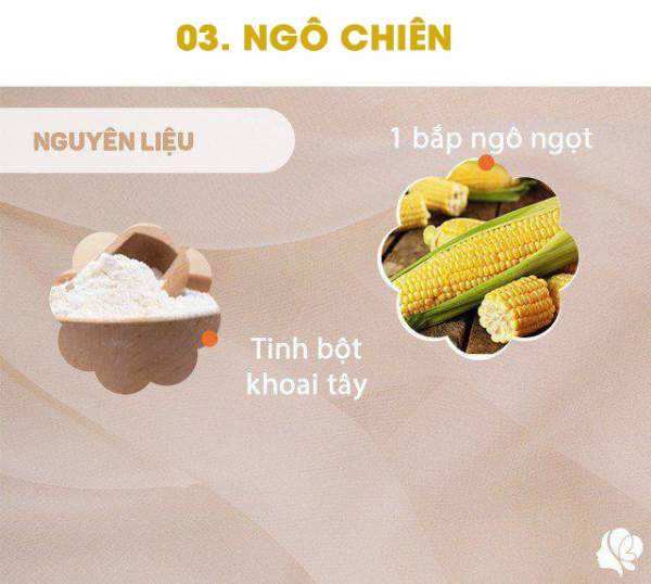 Chuẩn bị: 1 bắp ngô ngọt tách hạt, 1 lòng trắng trứng gà, bột chiên giòn, bột khoai tây, dầu ăn