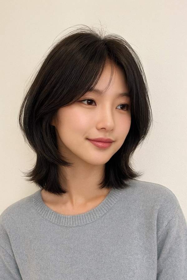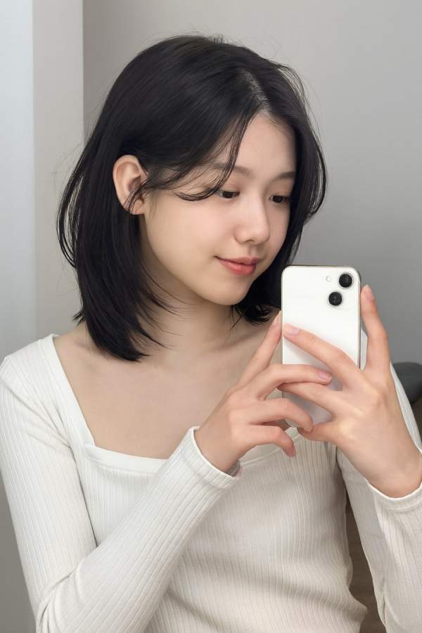 Với độ dài vừa đủ, kiểu tóc này dễ dàng ôm lấy gương mặt, tạo cảm giác nhẹ nhàng, cân đối. Phần đuôi được tỉa mảnh giúp tổng thể không bị thô, trong khi màu tóc đen lại càng làm nổi bật vẻ tự nhiên và nền nã.