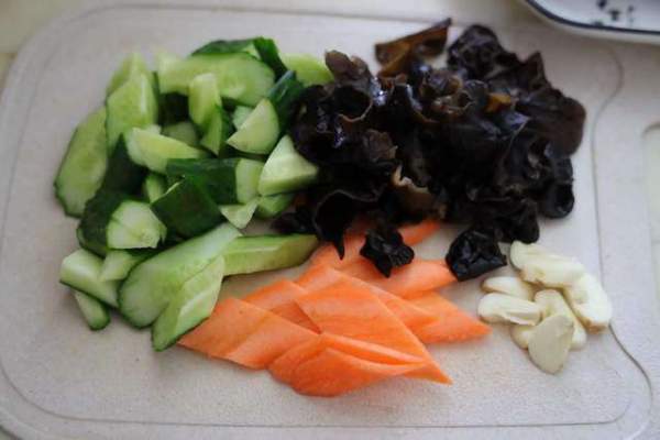Dưa chuột rửa sạch cắt miếng nhỏ. Ngâm nở mộc nhĩ, rửa sạch rồi thái nhỏ. Cà rốt gọt vỏ rửa sạch rồi cắt lát mỏng. Tỏi cắt lát để dùng sau.