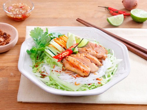 2 gói mì gạo, 2 phần thịt đùi gà (lọc bỏ xương, khoảng 100 gram, có thể dùng ức gà tùy sở thích), 1/2 quả dưa chuột, thái sợi; 1/4 củ cà rốt, thái sợi; 1 cây xà lách, thái nhỏ.