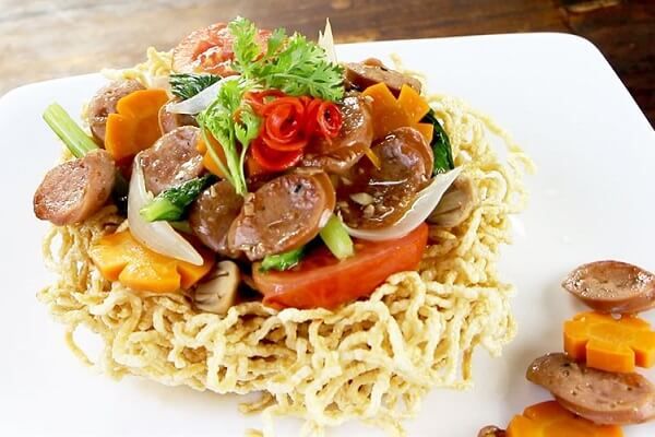 Đổ hỗn hợp sốt rau lên trên đĩa mì chiên giòn và dùng nóng.
