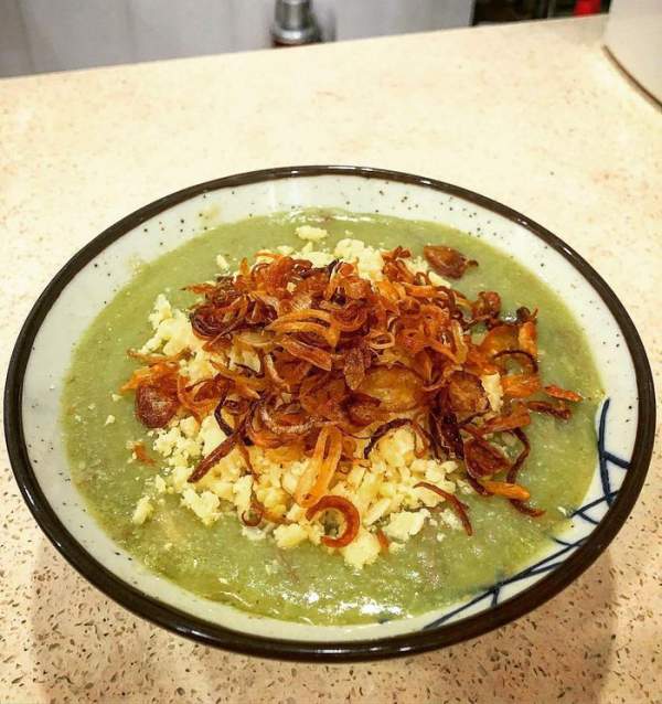 Bên cạnh tên gọi “lạ lùng” của món ăn, cháo khoái còn gây ấn tượng bởi màu xanh lạ mắt và hương vị thơm ngon khó cưỡng.