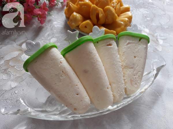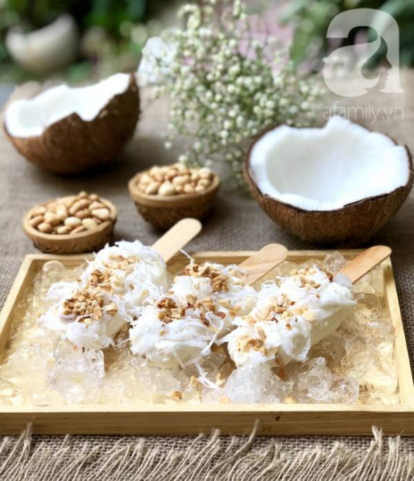 Nhúng khuôn kem vào nước nóng, rồi rút kem ra khỏi khuôn và xếp vào ngăn đông tủ lạnh lại cho đông đẹp mặt kem hơn. Áo thêm dừa bào sợi và đậu phộng rang nữa, như vậy món kem sẽ thơm ngon và hấp dẫn hơn nhiều!