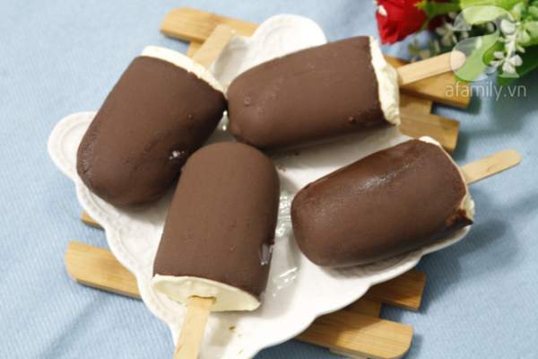 Khi kem đã đông bạn lấy socola cho vào 1 cốc chịu nhiệt, thêm bơ và kem tươi vào rồi đem đun cách thủy, khuấy đều cho tới khi hỗn hợp tan chảy hết là tắt bếp, lấy kem trong ngăn đá ra và rút kem que ra khỏi khuôn, nhúng vào cốc socola chờ cho socola khô lại là hoàn thành món kem que phủ socola rồi nhé.