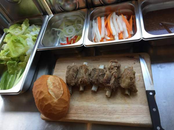 Đúng như tên, nhân của món này sẽ là những dẻ sườn dài, dày thịt hầm kĩ. Mỗi ổ bánh là một chiếc bánh mì nướng nóng giòn ăn kèm với đồ chua và một cây sườn. Vì sườn đã ninh mềm nên chỉ cần kẹp vào bánh, kéo nhẹ là phần xương tuột ra.