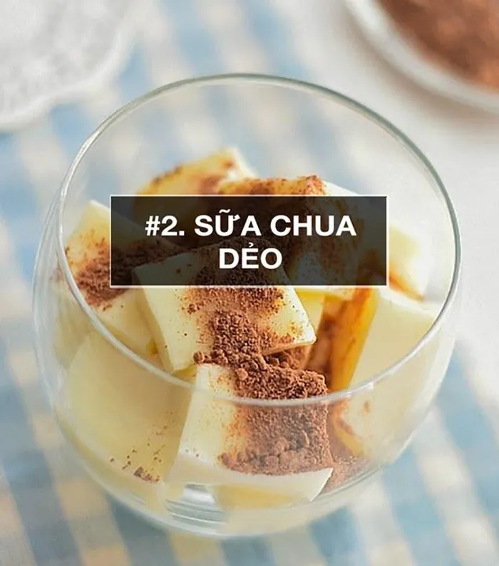 Dùng dao cắt sữa chua dẻo thành từng miếng quân cờ cho vào cốc. Rắc chút sữa bột milo lên trên rồi thưởng thức nhé!