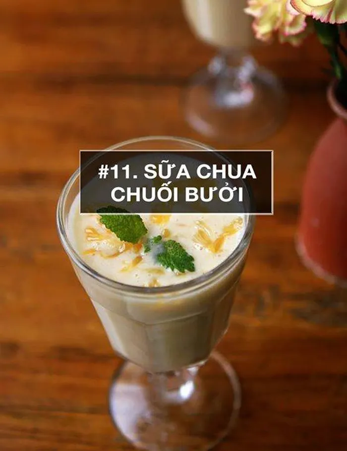 Cho phần thịt bưởi, chuối và sữa chua vào máy xay sinh tố. Chừa lại 1 ít thịt bưởi để trang trí bạn nhé!