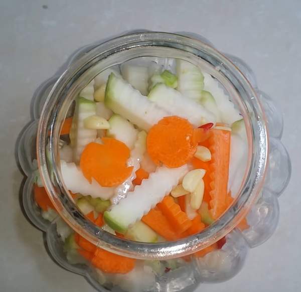 Bước tiếp theo, bạn cho su hào vào lọ thủy tinh rồi đổ nước ngâm vào ngập su hào, dùng vật nặng chèn lên trên cho su hào không bị nổi. Muối trong 2 - 3 ngày là có thể lấy ra thái miếng và thưởng thức.