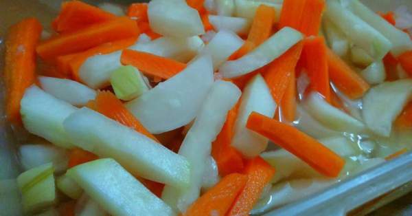 1. Cách muối su hào cà rốt: Su hào, cà rốt bạn đem gọt vỏ, cắt thành các lát mỏng vừa ăn hoặc tỉa hoa tùy thích. Sau đó bạn cho su hào, cà rốt vào chung một cái bát rồi xóc đều với muối ăn sạch tự nhiên. Khi su hào và cà rốt tiết ra nước thì bạn chắt bỏ đi rồi cho vào lọ thủy tinh sạch.