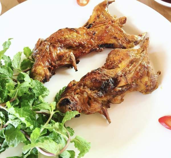Tri Tôn là huyện nằm tiếp giáp với Campuchia. Món ếch nhồi thịt nướng cuốn hút được cho có nguồn gốc từ đất nước này. Để chế biến, người ta cho thịt heo băm nhuyễn trộn sả, nghệ, lá chúc... vào trong bụng ếch rồi buộc vào cặp tre và nướng lên. Thịt ếch tỏa hương thơm, chín mềm, da vàng, phần thịt heo bên trong mọng nước, ngon ngọt. Ảnh: By.miachee.