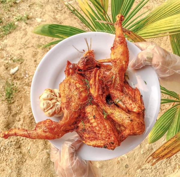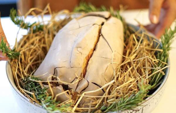 Gà nướng đất sét (hay còn có tên "gà ăn mày") là món ăn có nguồn gốc từ Trung Quốc. Đặc sản này cũng quen thuộc với người miền Tây. Gà được sơ chế kỹ, tẩm ướp gia vị. Nguyên liệu quan trọng tạo mùi thơm là lá chanh và sả băm nhét vào bụng gà. Khi đã ngấm vị, người làm tiếp tục lấy lá sen, lá chuối bọc quanh rồi đắp đất sét lên cho thật kín, cuối cùng đem nướng từ từ trên lửa nhỏ. Ảnh: Sapconceptstore.