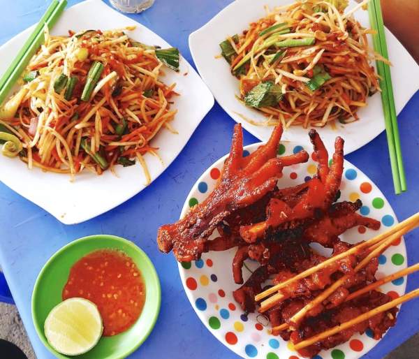 Kiểu xiên que thịt bò xắt mỏng, hơi lẫn nhiều mỡ, ướp ngũ vị hương rồi nướng chín thơm lừng cũng phổ biến trong ẩm thực vùng Tri Tôn. Món ăn thường được phục vụ kèm đu đủ đâm, một đặc sản có nguồn gốc từ Campuchia, do người Khmer tạo ra. Ảnh: Quanngo_256.