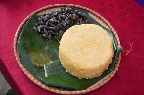 Cơm bồi được người dân địa phương khéo léo chế biến từ những nguyên liệu sẵn có ở núi rừng như hạt ngô, hạt gạo và cả củ sắn tươi. Món này thường được ăn kèm với ốc đực ở khe suối và cà lào trên rừng.