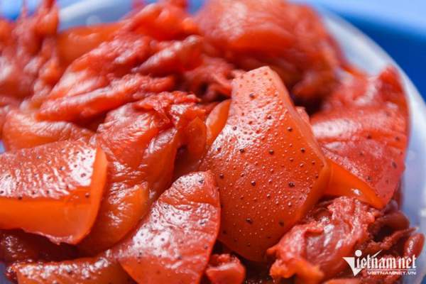 Mỗi ngày, bà Lập bán tới hơn 100 suất sứa đỏ chấm mắm tôm cho thực khách, chưa kể lượng khách đến mua sứa đỏ riêng mang về chế biến