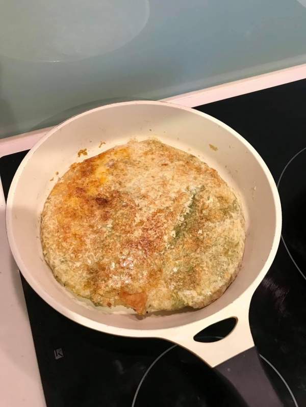 Bắc chảo không dính lên bếp, cho vào chút xíu dầu, láng đều. Dầu hơi nóng thì cho phần vỏ bánh trộn trứng vào, dàn đều, chiên khoảng 2 phút với lửa hơi thấp. Sau đó cho hết phần nhân bánh chưng cùng với tất cả rau củ cũng như pho mát vào.