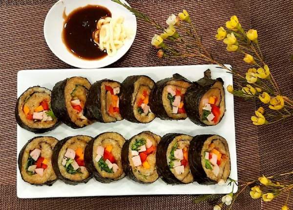 Kimbap bánh chưng với phần nhân phiên bản ’’vét tủ lạnh’’ cũng góp phần mang đến hương vị giòn dẻo, lạ miệng. Để thực hiện món ăn, bạn cần cắt mỏng bánh chưng, dầm nhuyễn rồi rán bằng nước. Khi bánh chưng se mặt thì tắt bếp, không nên rán vàng giòn sẽ khó cuộn.