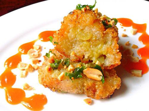 Trét khoai lên trên nếp rồi cuộn lại đem rán ngập dầu. Khi nếp giòn và vàng đều vớt ra đặt lên giấy thấm dầu. Dùng kéo cắt bánh thành khối vuông nhỏ, rưới nước cốt lên mặt bánh rồi đến mỡ hành, sao cùng là lạc rang giã nhỏ.
