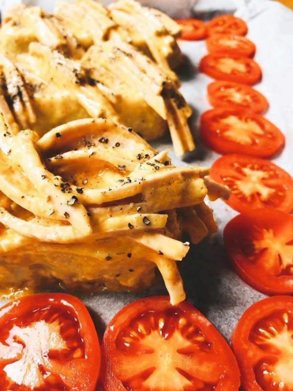 - Lấy một khoanh bánh chưng lăn qua bột mì cho phủ đều, nhúng vào tô trứng. Tương tự chả lụa cũng làm như vậy. Tiếp tục trang trí chả lụa lên bánh chưng theo ý thích, rắc hạt tiêu lên trên.