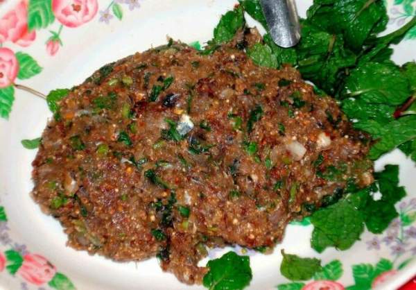 Larb dib là cái tên tiếp theo được xướng lên trong danh sách những món ăn du khách nên tránh xa khi đến xứ sở chùa vàng. Đây là một món ăn của vùng đông bắc. Món gỏi thịt sống này được làm từ thịt bò hoặc lợn sống, ăn kèm với nhiều loại gia vị, thảo mộc khác nhau. Ảnh: Wiki