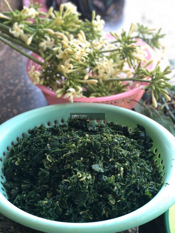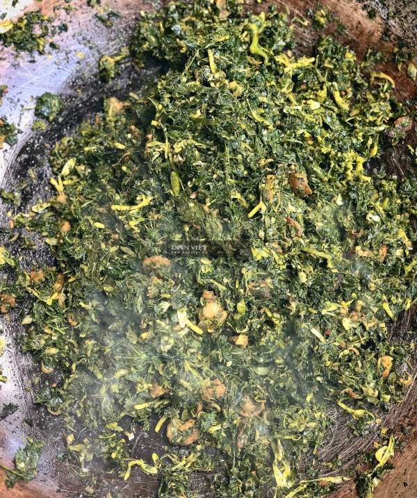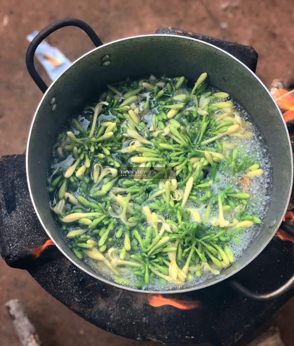 Hoa đu đủ đực được luộc sơ trước khi đem giã chung với lá mì và các nguyên liệu khác