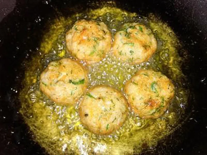 -Đổ bột chiên giòn ra tô. Lăn từng viên chả vừa nặn qua bột sao cho bột phủ đều tạo thành lớp mỏng bao quanh viên chả.