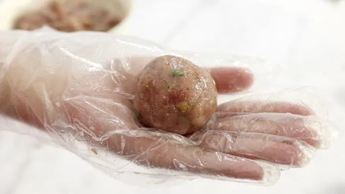 -Cho một ít dầu ăn ra lòng bàn tay, thoa đều để không bị dính tay khi viên chả cá. Múc một muỗng chả cho ra tay, ép dẹp lại và đặt trứng muối vào rồi vo tròn lại, cách làm tương tự như nặn bánh trôi. Viên lần lượt cho đến khi hết nguyên liệu.