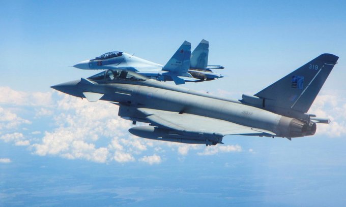 Tiêm kích Typhoon Anh (gần) theo dõi chiến đấu cơ Su-30SM Nga trên Biển Baltic hồi năm 2019. Ảnh: BQP Anh