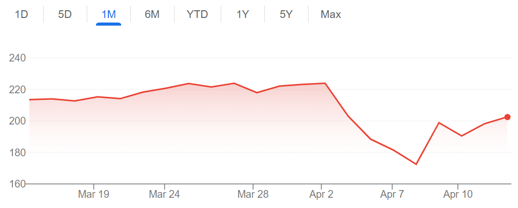 Sang tháng 4, mã này giảm liên tiếp 4 phiên từ ngày 2/4 - thời điểm ông Trump công bố chính sách thuế đối ứng và chỉ tăng trở lại khi Mỹ hoãn áp dụng 90 ngày với các đối tác thương mại, trừ Trung Quốc. Các nhà phân tích tại Morgan Stanley cho biết việc Mỹ miễn thêm thuế đối ứng với thiết bị điện tử sẽ giúp gánh nặng thuế hàng năm của Apple giảm từ 44 tỷ USD trước đó về 7 tỷ USD.